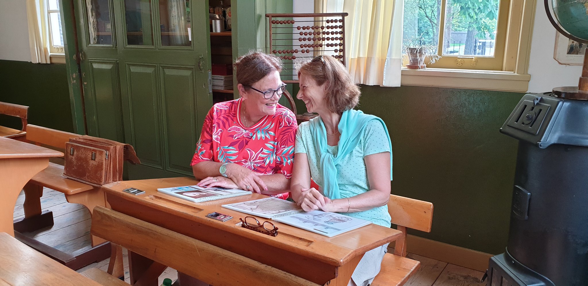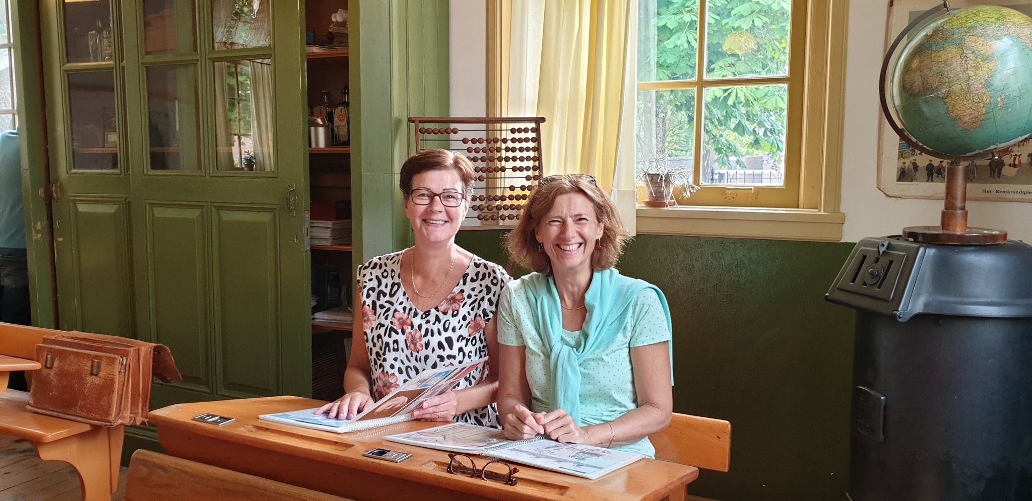 In het oude schoolgebouw hadden we bakvissen lol, toen we onszelf in een opstelling van twee in de oude schoolbanken wurmden voor een foto.